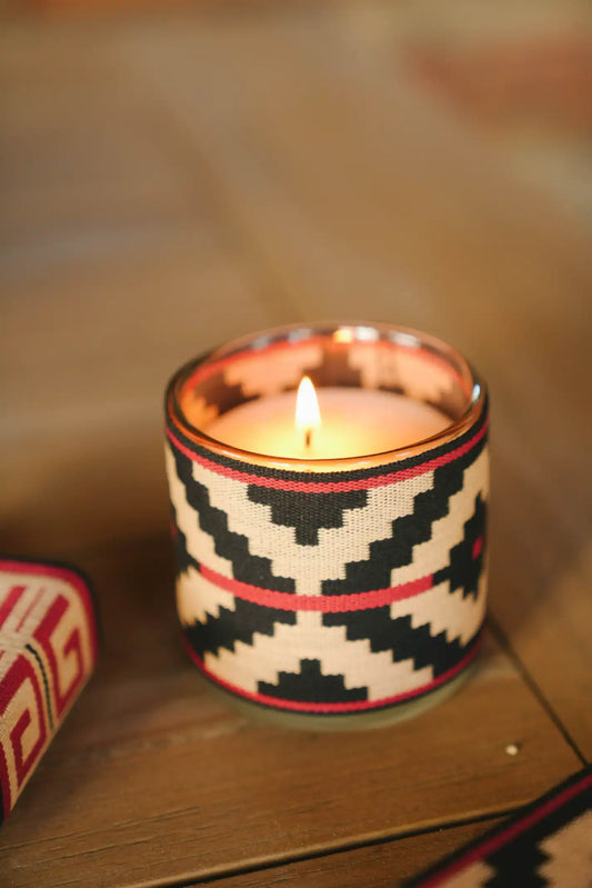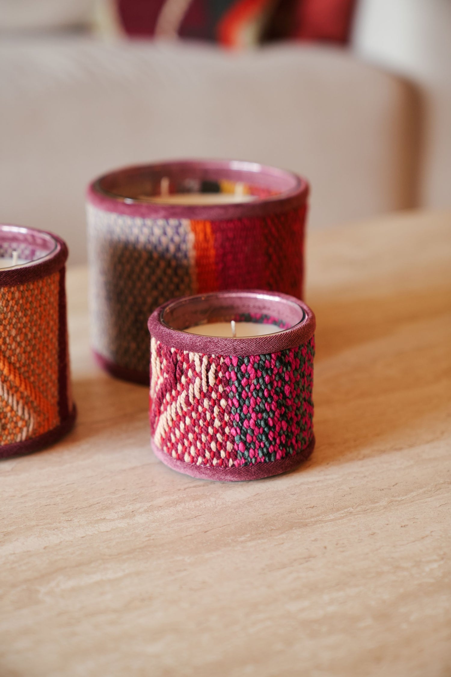 Les bougies de la collection Pérou sont toutes des pièces uniques, habillées de chutes de tissus péruviens tissés à la main dans les Andes. Reconnue pour ses couleurs vives et son artisanat, cette collection met en valeur le savoir-faire andin.