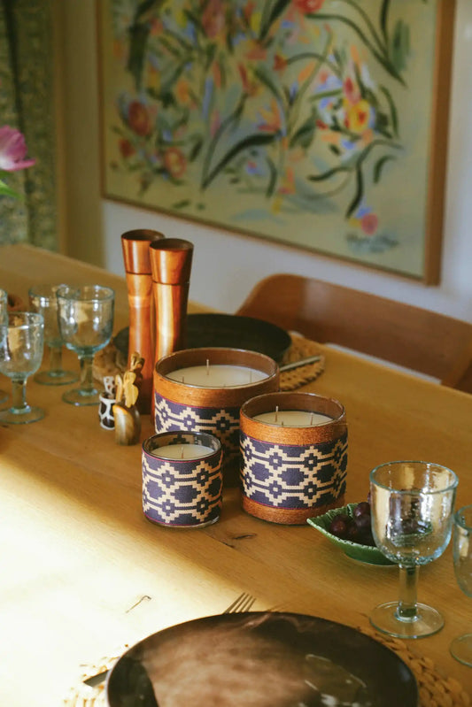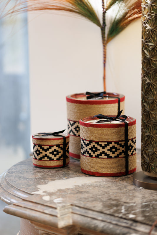 These candles are covered in authentic Argentinian fabrics. Worn as belts by gauchos in the Pampas, these fabrics are symbols of the country's legend and folklore. This collection is scented with our "Walk in the Forest" fragrance, a subtle blend of cedar, amber, and eucalyptus.