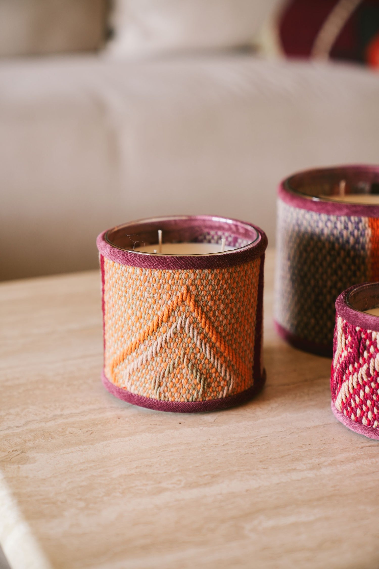 These candles are covered with scraps of fabric handwoven by a civilization of women in Peru. Each candle is a unique piece, reflecting Andean craftsmanship and its bright, vibrant colors. This collection is scented with our "Walk in the Forest" fragrance, a subtle blend of cedar, amber, and eucalyptus.