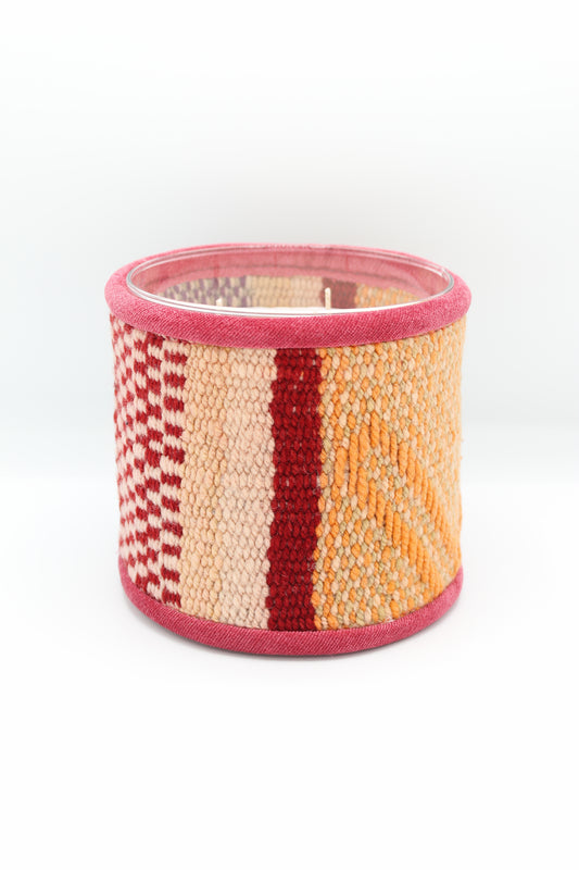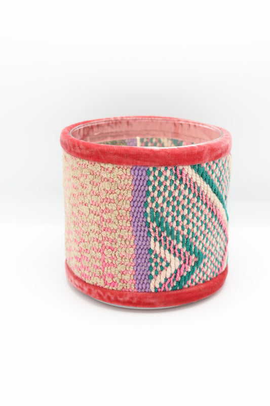 These candles are covered with scraps of fabric handwoven by a civilization of women in Peru. Each candle is a unique piece, reflecting Andean craftsmanship and its bright, vibrant colors. This collection is scented with our "Walk in the Forest" fragrance, a subtle blend of cedar, amber, and eucalyptus.
