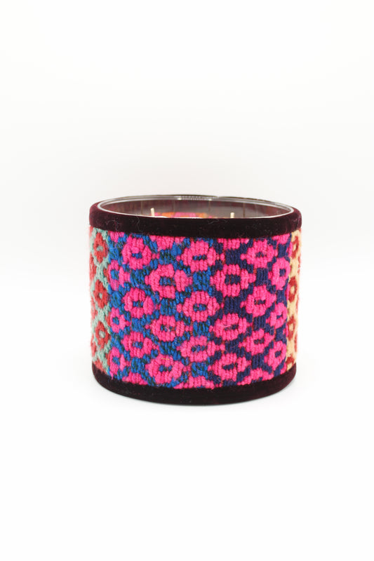 These candles are covered with scraps of fabric handwoven by a civilization of women in Peru. Each candle is a unique piece, reflecting Andean craftsmanship and its bright, vibrant colors. This collection is scented with our "Walk in the Forest" fragrance, a subtle blend of cedar, amber, and eucalyptus.
