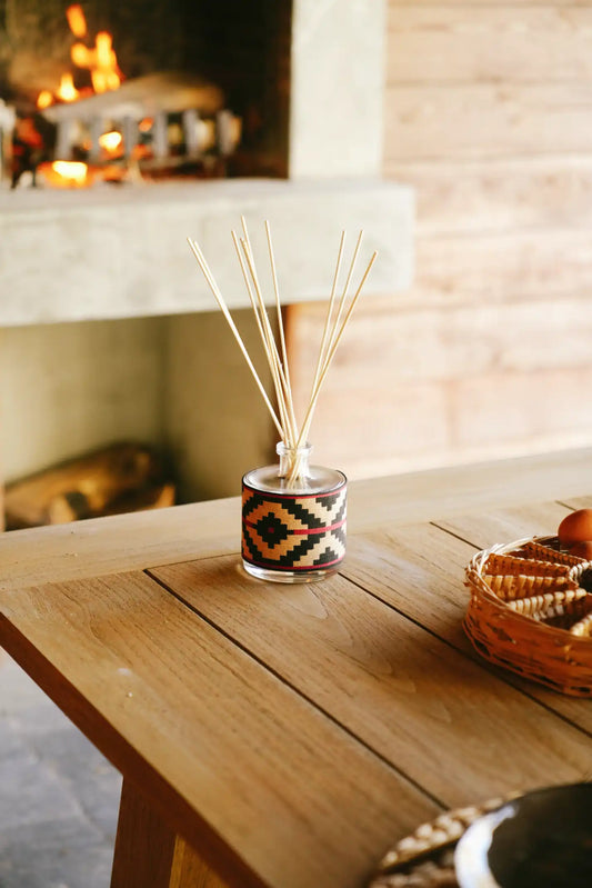 These diffusers are covered in authentic Argentinian fabrics. Worn as belts by gauchos in the Pampas, these fabrics are symbols of the country's legend and folklore. This collection is scented with our "Walk in the Forest" fragrance, a subtle blend of cedar, amber, and eucalyptus.