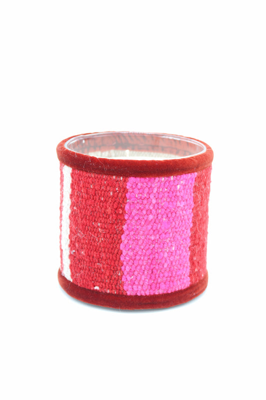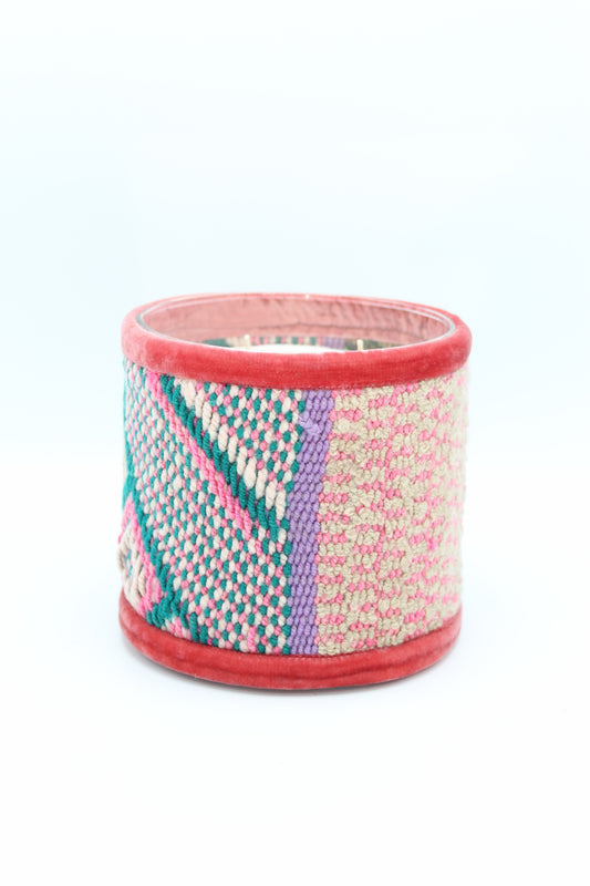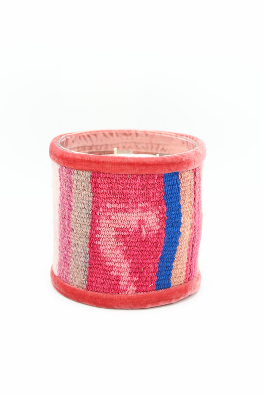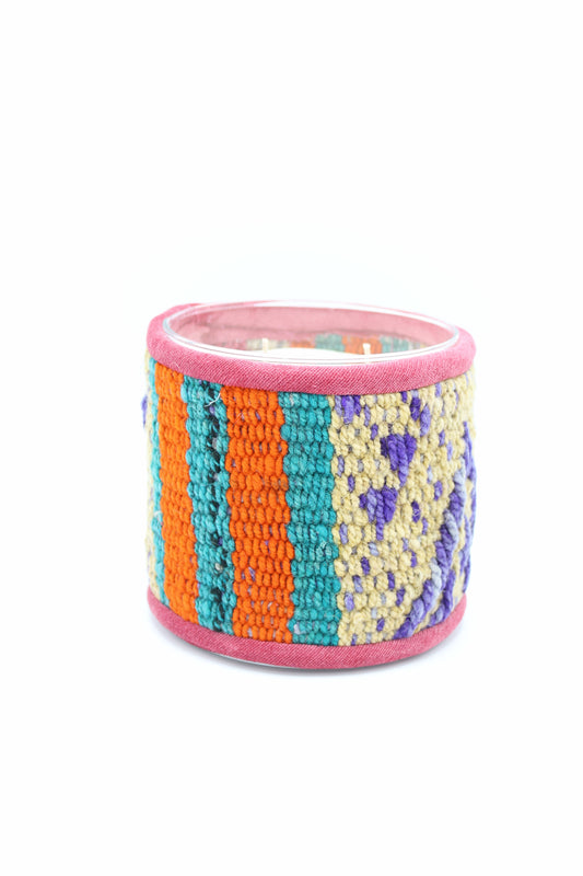 Deze kaarsen zijn bedekt met stukjes stof, handgeweven door een Peruaanse vrouwencultuur. Elke kaars is een uniek exemplaar, dat het vakmanschap uit de Andes weerspiegelt en zijn heldere, levendige kleuren. Deze collectie is geparfumeerd met onze "Walk in the Forest" -geur, een subtiele mix van kaneelblaadjes , oranjebloesem en eucalyptus .